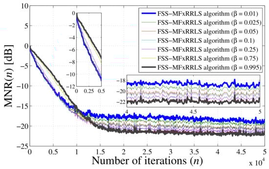 It is no surprise that, like any FSS-based adaptive algorithm, the proposed FSS-MFxRRLS algorithm would also exhibit a trade-off situaiton for selecting the FSS: a large step size gives fast convergence but poor steady-state performance, and a small value would slow down the convergence speed while improving the performance at the steady state. Such a trade-off situation can be overcome by considering a variable step size (VSS) procedure which would automatically ‘tune’ the step size starting from a large value at the start to a small value as time progresses [45,46,47,48]. This would help in achieving both a fast initial convergence as well as a good steady-state performance. Recently, employing a convex combination of two adaptive filters has gained some popularity [49], where one adaptive filter is adapted using a large step size and the other using a small one. Their outputs are combined using a (convex) mixing parameter such that the overall output is decided by a fast converging adaptive filter (using a large step size) during the transient state and by a slow converging adaptive filter (using a small step size) at the steady state [50,51]. Since both adaptive filters are adapted simultaneously, it is obvious that this approach wound result in an increased computational complexity.