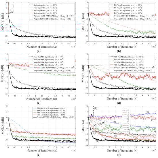 The simulation results for noise sources from a mixed distribution (49) with , , and are presented in Figure 14. As described earlier, the reference signal is mostly (75%) Gaussian, with (25%) impulsive samples coming from a less impulsive distribution as compared with the previous experiments. Therefore, all algorithms considered hereby show improved performance as compared with the previous experiments. Nevertheless, the FSS-based algorithms have a trade-off situation for the selection of appropriate step-size parameters. The proposed CCSS-MFxRRLS algorithm does not suffer from such a trade-off issue and achieves the best performance.