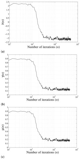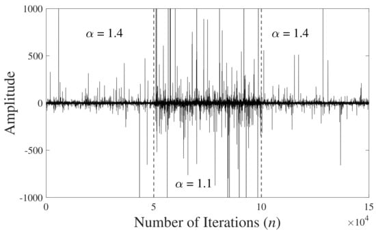 Three situations have been considered. In the first experiment, the values for characteristic exponents have been selected as and . For , the corresponding standard SS distribution is Gaussian, and for the corresponding distribution is severely impulsive. The mixing parameters has been selected as , which indicated that 50% of (randomly selected) samples have been generated from the standard SS distribution with (Gaussian), and the rest of 50% (randomly selected) samples have been drawn from the standard SS distribution with (severely impulsive). Figure 11a shows one realizations of a typical reference signal obtained from such a mixed distribution (49). It is noticed that the generated signal is indeed severely impulsive with variance being estimated to be . In the second experiment, the parameters in (49) have been selected as , , and . This choice of parameter values shows that the 75% of (randomly selected) samples have been generated from standard SS distribution with (Gaussian), and merely 25% (randomly selected) samples are from standard SS distribution with (severely impulsive). Since majority (75%) of samples have been (randomly) drawn from the Gaussian distribution, this situation would correspond to less impulsive nature as compared with the previous case for . A typical signal drawn from such a mixed distribution is shown in Figure 11b with the corresponding variance being estimated to be . In the third experiment, the parameters in (49) have been selected , , and . In this case, the samples from non-Gaussian stable distribution are from a less impulsive source compared with the previous examples. A typical signal drawn from such a mixed distribution is shown in Figure 11c, which has a variance of and looks more or less a Gaussian signal as impulses are less frequent as compared with the signals shown in Figure 11a,b. The simulation parameters have been adjusted experimentally as in the previous experiments.