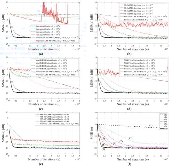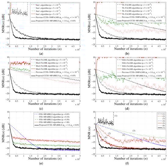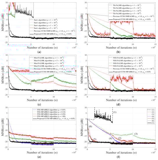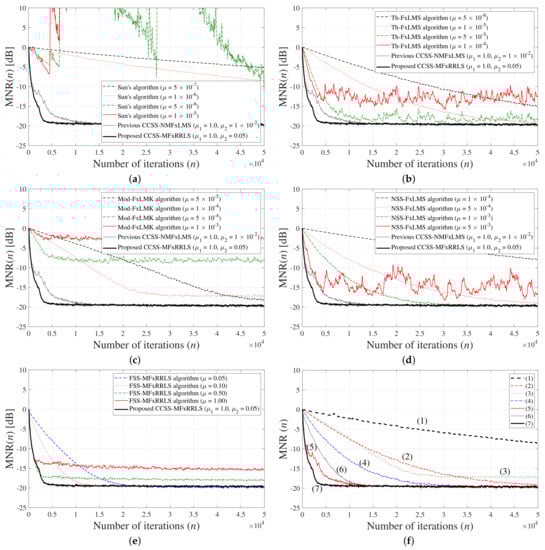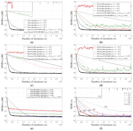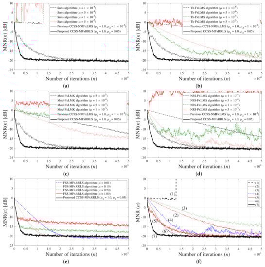 Detailed simulation results for reference signals from mixed distribution (49) with , , and ; (a) Sun’s algorithm [24]; (b) Th-FxLMS algorithm [25]; (c) modified FxLMK algorithm; (d) INSS-FxLMS algorithm [26]; (e) effect of step-size parameter in the proposed FxRLS-based impulsive ANC algorithms; (f) performance comparison between various algorithms: (1) Sun’s algorithm (); (2) Th-FxLMS algorithm (); (3) modified FxLMK algorithm (); (4) INSS-FxLMS algorithm (); (5) previous CCSS-NMFxLMS algorithm (); (6) FSS-MFxRRLS algorithm (); (7) proposed CCSS-MFxRRLS ().
