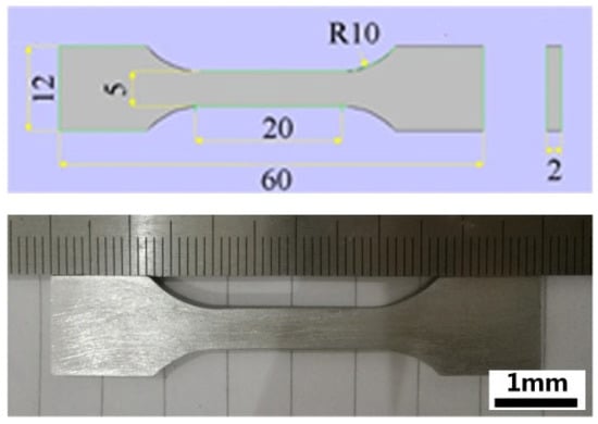 The macroscopic microstructure of the sample was observed with a Nikon EPIPHOT 300 metallographic microscope. The sample was pre-ground and then polished. Finally, the polished samples were chemically etched. The etchant was a picric acid solution (5 g picric acid, 5 mL acetic acid, 10 mL deionized water, 100 mL ethanol), and the etching time was 30 s. The FEI Nvo Nano SEM 450 electron microscope was used to observe the microstructure and fracture morphology. In order to study the effect of milling on the microstructure of the magnesium alloy samples, the grain size was measured by the line intercept method [14]. The tensile test instrument was a Shimadzu AGS-X universal material testing machine, used according to the ISO 6892-1-2009 standard. During a tensile test with a tensile speed of 1.5 mm/min, three specimens were taken along the feeding and building directions of the HWMM-produced thin wall, whose dimensions were 12 mm in width, 2 mm in thickness and 60 mm in length, and the model and physical diagram of the tensile specimens are shown in Figure 1. The results reported for the ultimate tensile strength, yield strength and elongation represent the averages for the three specimens. The anisotropic percentages of ultimate tensile strength or elongation corresponds to the ratio of the difference in test values between the building and feeding directions to the value of the feeding direction.