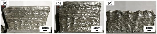 Figure 3 is the profile of the single thin-walled wall of Group 3 using the Mg alloy CMT process. It can be seen that the CMT mode under the Mg alloy CMT process has a smooth surface, but the spreading effect is poor. When the wire filling speed increases to 7 m/min, the first and the second layers’ morphology is improved, and the fish scale is clearer and more uniform, but the hump still appears in the subsequent forming, resulting in some voids in the sample. The deposited layer surface in the swing welding process is smooth, the spreading effect is better, and the fish scales are clear and evenly distributed.