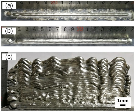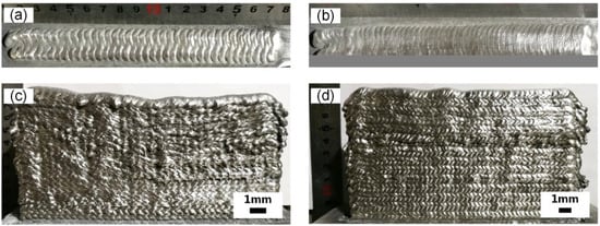 Figure 2 is a single thin-walled wall profile obtained using the AlMg4,5Mn CMT process (see Table 2 for the corresponding process parameters of different group numbers). Group 1 and Group 2 were continuously formed at 132.2 mm and 70.9 mm, respectively. It can be seen that the side of the swing-welded specimen is smooth, but the hump phenomenon appears, and the side profile fluctuates greatly. Pure CMT is prone to flow during the deposition process, resulting in a rough local surface.