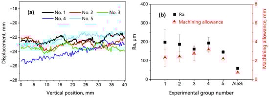 Figure 5 shows the side-wall scanning contour results of a single thin-walled wall. The surface roughness (Ra) and machining allowance of Group 1 and Group 2 using the AlMg4,5Mn CMT process are not notably different. The Ra and machining allowance of Group 5 using the Mg alloy CMT process are the minimum values, which are 146.1 μm and 2.2 mm, respectively, and they are 24.7% and 29% lower than those of Group 4 (194 μm and 3.1 mm). In addition, the Ra of Group 4 is 90% higher than that of the HWMM-produced Al5Si aluminum sample [31]. At the same time, the Ra and machining allowance of Group 5 are reduced by 21.9% and 4.3%, compared with the minimum value in the AlMg4,5Mn CMT process. In addition, the deviations of Ra and machining allowance in Group 1 are the largest among the four groups, and they are 68.9 μm and 0.9 mm, respectively. The deviation of the Ra and machining allowance in Group 5 is 8.4 μm and 0.1 mm, respectively, being 88.4% and 88.9% lower than that in Group 1. Therefore, the swing welding Mg alloy process deposition is better. This better process parameter includes the wire feeding speed of 12 m/min, the scanning speed of 4 mm/s, the swing welding frequency of 5 Hz, and the amplitude of 8 mm.