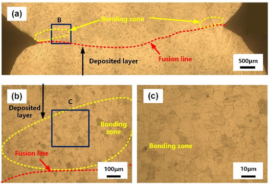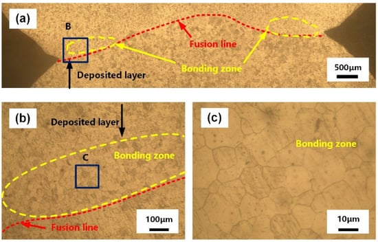 Figure 6 shows the cross-section microstructure of the WAAM-processed AZ31B magnesium alloy. It can be seen that the microstructural features of WAAM-processed samples are essentially similar to those of the WAAM-processed Al5Si aluminum alloy [32], which is composed of three parts: a fusion line, deposited layer and bonding zone. The average grain size of the bonding zone is 11.8 μm, which is 56.3% less than that of the deposited layer, and the bonding zones are distributed in the sample edge area, which is consistent with the characteristics of the swing welding path. The fusion line is denoted by the stripes with a convex distribution in Figure 6a.