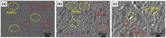 The SEM microstructure of the HWMM-processed sample is shown in Figure 8. It can be seen that α-Mg forms a dark substrate, and white particles of Al8Mn5 and Mg17Al12 of different sizes are distributed on the substrate [19]. The larger granular Al8Mn5 phase is precipitated directly from the liquid phase, and its Al and Mn atoms can aggregate rapidly, while the small granular Mg17Al12 phase is precipitated from the supersaturated α-Mg solid solution.