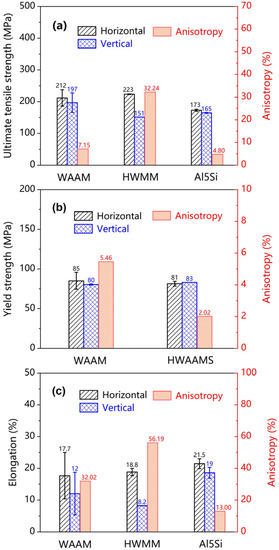 As shown in Figure 9, the tensile strength of the HWMM-processed AZ31B magnesium in the horizontal direction is 5.2% higher than that of the WAAM-processed AZ31B magnesium, while the tensile strength of HWMM in the vertical direction is smaller than that of WAAM. Therefore, the anisotropy of HWMM is significantly higher than that of WAAM, and its anisotropy is 32.2%, far greater than 5%. At the same time, the tensile strength deviation of the HWMM-fabricated AZ31B magnesium is smaller than that of the WAAM-fabricated AZ31B magnesium. The yield strength of the HWMM-processed AZ31B magnesium in the horizontal direction is 3.5% lower than that of the WAAM-processed AZ31B magnesium, while the yield strength of the HWMM-processed AZ31B magnesium in the vertical direction is larger than that of the WAAM-processed AZ31B magnesium, so the anisotropy of the HWMM-processed AZ31B magnesium is less than that of the WAAM-fabricated AZ31B magnesium. At this time, the anisotropy of the HWMM-fabricated AZ31B magnesium is 2.0%, less than 5%, and the anisotropy of the yield strength of the HWMM-processed AZ31B magnesium is not significant. The elongation in the horizontal direction of the HWMM-processed AZ31B magnesium is smaller than that of the WAAM-processed AZ31B magnesium, and the elongation in the vertical direction is 30.8% lower than that of the WAAM-processed AZ31B magnesium. At the same time, the elongation anisotropy of the HWMM-fabricated AZ31B magnesium is 56.2%, which is far greater than 5%. The difference in elongation is significantly credible. The tensile strength and elongation anisotropy of the HWMM-processed Al5Si aluminum alloy is 4.8% and 13%, respectively [32]. The anisotropy in the tensile strength and elongation of the AZ31B sample was 32% and 56%, respectively, being 6 and 3.3 times higher than that of the Al5Si samples.