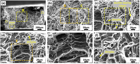 SEM micrographs of sample 7 tensile fracture: (a) overview, (b) details of region B, (c) details of region C, (d) details of region D, (e) details of region E, (f) details of region F.