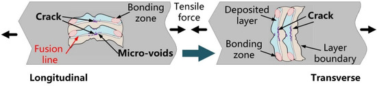 During the forming process of magnesium alloy, it is easy to observe oxides formed on the surface, resulting in some defects such as incomplete fusion and porosity. It leads to the fracture of the magnesium alloy near the fusion line, which occurs more easily than in aluminum alloy during the tensile process, as shown in Figure 11. Therefore, the tensile property decrease in magnesium alloy along the deposition direction is larger than that in aluminum alloy. The tensile properties along the feed direction are less affected by the uneven structure near the fusion line. As a result, the tensile strength and elongation anisotropy of the AZ31B magnesium alloy samples is larger than those of the Al5Si aluminum alloy.