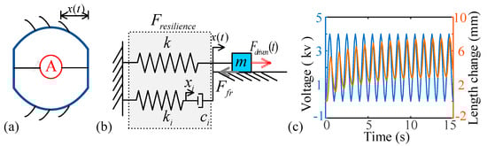 The dielectric elastomer actuator can deform the body segment under the action of periodic excitation voltage [43]. Figure 1 shows the model schematic diagram for the deformed body segment driven by the dielectric elastomer actuators. When the tail of the body segment is fixed, the displacement of the body segment head is assumed as x(t), as shown in Figure 1a. The simplification model of the body segment is obtained, as shown in Figure 1b. is the ultra-low frequency excitation. The body segment can realize reciprocating deformation under ultra-low frequency excitation. We refer to the results in reference [50], where four viscoelastic-spring components accurately describe the dynamic characteristics of the dielectric elastomer actuators.