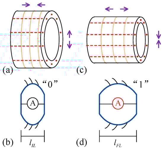 The driven muscle groups for earthworms are composed of longitudinal muscles and circumferential muscles. For each segment, a schematic diagram of muscle distribution is shown in Figure 2a,c. The red dotted lines represent the longitudinal muscles, which are distributed along the parallel direction of the segment. The solid yellow lines represent the circumferential muscles, which are distributed along the circumference of the segment. When a segment of the earthworm is in a contracted state, the circumferential muscles elongate and the longitudinal muscles contract, as shown in Figure 2a; this is defined as the initial state. The original length of the body is defined as lIL, as shown in Figure 2b, and the state of the nonactuated segment is defined as “0”. When a body segment of the earthworms is in the elongated state, the longitudinal muscles elongate and the circumferential muscles contract, as shown in Figure 2c. The elongation state of the body segment is defined as the actuated state, defined as “1”. After the segment is driven, its length reaches the maximum value: lFL, as shown in Figure 2d.