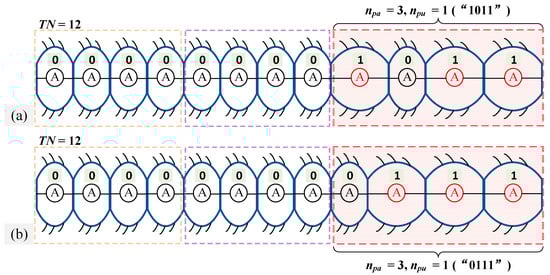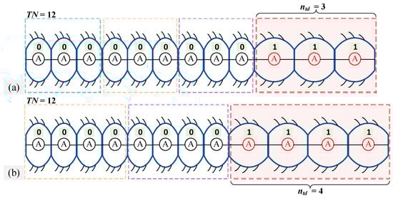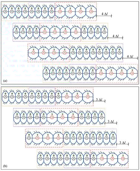 For a driven module with np segments, the number of initial modular gait distributions with the B-DM is 2n − 2. For example, for a B-DM with four segments, there are 14 initial modular gait distributions that satisfy the conditions (4). Figure 4 shows two examples of initial gait distributions for the B-DM in a 12-segment earthworm-like robot. Figure 4a,b show two different initial gait distributions. In Figure 4a, we assume that a broken body segment (“0”) in one of the driven modules is not at the boundary of the driven module. The broken body segment “0” is at the boundary of the driven module, as shown in Figure 4b. In practical application, the distribution of the nonactuated body segment “0” of one driven module can be designed according to the required operating conditions.
