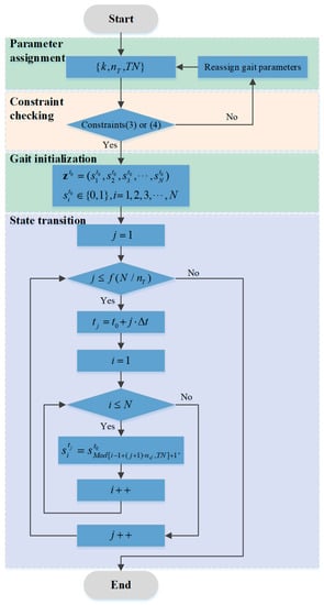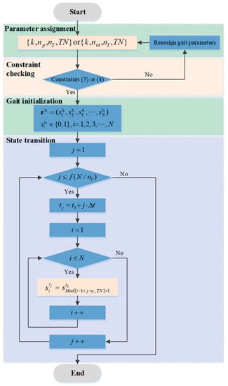 A generation algorithm for MG-II is proposed to obtain the locomotion gait, according to the receding peristaltic wave and the state transmission rule, given as Equation (10). The routine of the algorithm is shown in Figure 7, which can generate all the permissible locomotion gaits.