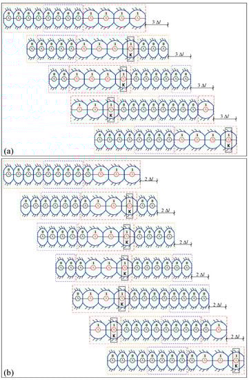 With the proposed gait generation algorithm in Figure 7, Figure 8 demonstrates the locomotion gait transmissions of the 12-segment robot with MG-II under two cases: total or partial actuated segments. Figure 8a shows a gait generation demonstration for a 12-segment robot under U-DM, while Figure 8b shows a gait generation demonstration for a 12-segment robot under B-DM. Assuming that each driven module contains four segments, the number of transmission segments is less than the number of segments in one driven module (for the driven mode with MG-II). Then, overlapped segments can occur in the transmission of the driven module. The overlapped segments keep the state of the previous movement, which are called “K” segments, as shown in Figure 8.