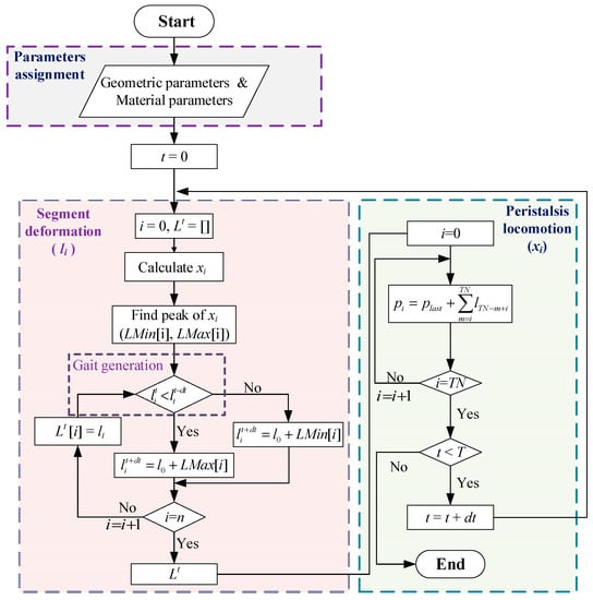 In order to simulate the locomotion of the earthworm-like robot, a flow chart of the calculations, which consists of three parts, is shown in Figure 9. It is assumed that each movement of the peristaltic wave adopts complete anchorage without slip. First, the parameters, including the geometric parameters (initial body length l0; the number of body segments TN) and material parameters (the linear spring with stiffness k, spring stiffness ki, the viscous coefficient ci, and the equivalent mass m) are assigned. Then, after the input excitation voltage, the xi is calculated by Equation (1). The minimum and maximum points of xi are stored with LMin[i] and LMax[i], respectively. The body length li (t) of the actuated segment can be calculated by Equation (2). Finally, taking the position of the last body segment, , as a reference point, the peristalsis locomotion pi path of the earthworm-like robot is obtained by updating the coordinates of the body segment, according to