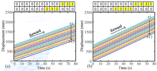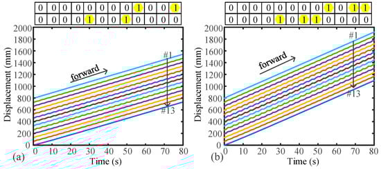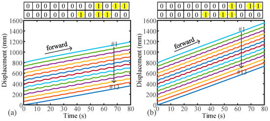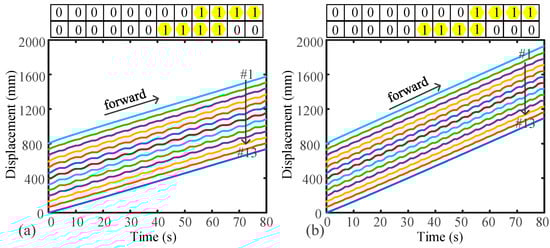 Figure 13 shows the locomotion for B-DM under MG-II. The B-DM consists of three actuated segments and one nonactuated segment (“1011”). As two segments are transmitted at a time, there are two segments that are overlapping waves, as shown in Figure 13a. The frequency of the receding peristaltic wave is 1/6, and the amplitude of the receding peristaltic wave is 2. When the number of transmission segments is three, there is one segment that is an overlapping wave, as shown in Figure 13b. The frequency of the receding peristaltic wave is 1/4, and the amplitude of the receding peristaltic wave is 2. Therefore, a faster frequency can also obtain greater speed. When more actuated segments are transmitted at a time, the earthworm-like robot can obtain a faster speed.