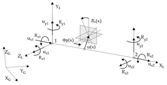 In this paper, the single-layer steel domes are modeled using frame elements, which have 6 degrees of freedom at the node (Figure 1) (ux, uy, uz, Rx, Ry, Rz, where u denotes displacements in the XG, YG, or ZG direction in a global coordinate system, and R denotes rotations around the axes). The local coordinate system of an element is a dextrorotary Cartesian system with the following orientation of axes. The local x axis is always the longitudinal element axis, whose direction is defined from the beginning point to the end point. The local axes y and z lie in the plane of the bar section and are arranged according to dextrorotary rotation. By standard, the axes mentioned represent: y axis—the axis of the greater moment of inertia of a bar, the z axis—the axis of the lesser moment of inertia of a bar (depending on the element section).