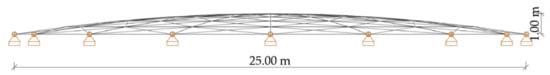 The Schwedler dome [9] with diameter of 25 m and height of 1 m is situated in the Beskid Niski Mountains (Poland). A reinforced concrete ring supported by 16 reinforced concrete columns, 5 m high, constitutes a rigid support for the dome. The structure can cover the sports and entertainment hall. The dome consists of 81 nodes and 224 bars (Figure 2 and Figure 3). Each of the bars was divided into 10 finite elements. The elements of the structure were made of steel tubes with yield stress fy = 355 MPa, Young’s modulus E = 210 GPa, and Poisson’s ratio v = 0.3. In order to dimension the designed structure, three groups of rods were modeled: meridians, parallels, and diagonals. Each meridian has a length of 2.511 m. The lengths of the parallels are, respectively: 4.877 m, 3.908 m, 2.934 m, 1.958 m, and 0.979 m. The roofing consists of tubular steel bars and glass panels. The loads were collected in accordance with applicable standards [N.1–N.3]. The static-strength analysis was performed according to EN-1993-1-1 [N.4] using Autodesk Robot Structure Professional 2022 software for the spatial frame structure, intended to produce the dimensioning of the steel elements. This structure was designed according to geometrically nonlinear analysis. Cross sections of individual groups of members are as follows: parallel (RO 273 × 8), meridian (RO 127 × 8.8), diagonal (RO 82.5 × 6.3).