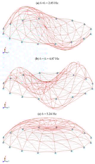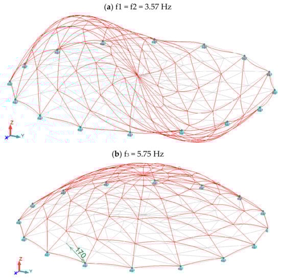 Table 7, Table 8, Table 9 and Table 10 summarize the results of the geodesic dome analyses. Table 7 lists the critical load multipliers for the linear buckling analysis and the non-linear buckling analysis. Table 8 shows a comparison of the geodesic dome vibration frequency for standard modal analysis and modal analysis with normal forces considered. The current and effective masses for both considered cases are compared in Table 9 and Table 10, respectively. Figure 8 shows a graphical summary of the eigenvectors in the case of a standard modal analysis.