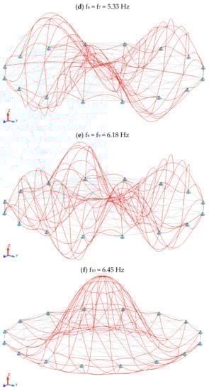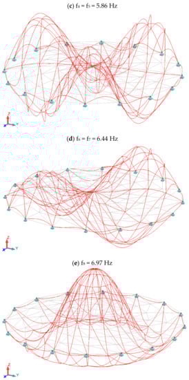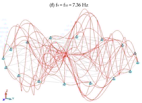 Table 1, Table 2, Table 3 and Table 4 summarize the results of analyzes for the Schwedler dome. Table 1 shows the critical load multipliers for linear buckling analysis and non-linear buckling analysis. Table 2 lists the vibration frequencies of the Schwedler dome in the case of standard modal analysis and modal analysis with normal forces taken into account. A graphical summary of selected eigenvectors of the standard modal analysis of the Schwedler dome is shown in Figure 4. Table 3 and Table 4 show the current masses and effective masses for the first 10 forms, respectively.