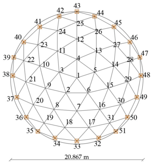 The geodesic dome [33] with the span equal to 21 m and rise equal to 6.5 m lies in the Beskid Niski Mountains in Poland. The dome is based on 20 reinforced concrete columns, 5 m high. The whole covering is closed with a reinforced concrete ring forming a rigid structure, which simulates boundary conditions. The structure can cover the sports and entertainment hall. The dome consists of 51 nodes and 130 bars (Figure 6 and Figure 7). Each of the dome bars was divided into 5 finite elements. The elements of the structure were assumed to be made of steel tubes with yield point fy = 235 MPa, Young’s modulus E = 210 GPa, and Poisson’s ratio v = 0.3. The loads were collected in accordance with applicable standards [N.1–N.3]. The static-strength analysis, intended to produce the dimensioning of the steel elements, was performed acc. To EN-1993-1-1 [N.4] using Autodesk Robot Structure Professional 2022 software for spatial frame structure. This structure was designed according to linear analysis. The bars of the structure were made with RO 101.6 × 8. The mass of the geodesic dome is 25,350.7 kg.