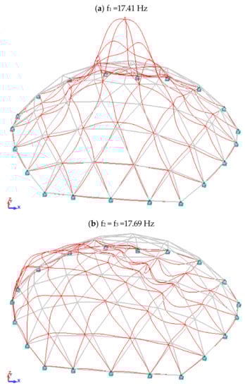 After this short introduction, let us return to the two domes analyzed in the paper. The first is the geodesic dome. The mass of the dome is 25,350.7 kg. The critical load multiplier in both linear and nonlinear buckling analysis is quite high, 12.42 and 11.45, respectively. The relative error is (12.42 − 11.45)/11.45 = 0.08 = 8%. Such values of the critical load multiplier, in accordance with the standard guidelines, entitle us to design structures in accordance with the first order theory. In the case of standard modal analysis, the first eigenvalue is 17.41 Hz, and after taking into account normal forces, it is 17.35 Hz. The relative error is (17.41 Hz − 17.35 Hz)/17.35 Hz = 0.0035 = 0.35%. The influence of normal forces on the obtained values of structure characteristics in the analysis of stability and dynamics is negligibly small. We did not observe a significant change in the stiffness of the structure after taking into account the normal forces. The presented design situation applies to most building structures, but not all.