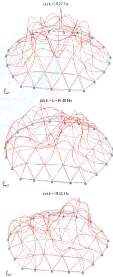 It is worth noting the different form of deformation of both considered structures. In the case of the Schwedler structure, there is a clear tendency to global deformation (taking into account the entire structure at the same time), while in the case of the geodesic dome, local rod deformations dominate. In the case of the Schwedler dome, the first form of vibration is antisymmetric, while in the case of the geodesic dome, it is symmetrical.