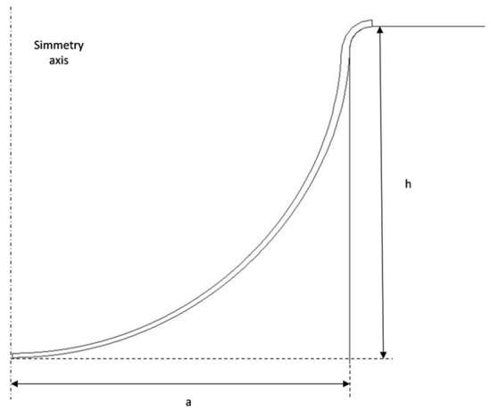 Magnesium alloys of industrial interest were extensively described in [47]. The superplastic magnesium alloy used in this work was AZ31; it is characterized by a weight percentage of 3% Al and 1% Zn and an average grain size of 10 µm. The sheet is used in the form of a disc with a thickness of 1.0 mm and a diameter of 80 mm. To identify the optimal superplastic conditions, it was subjected to free-forming tests at constant pressure and for different forming temperatures. The free-forming test is schematically represented in Figure 2. The figure shows two characteristic geometric parameters: the radius of the cylindrical die, a, and the height of the dome, h.