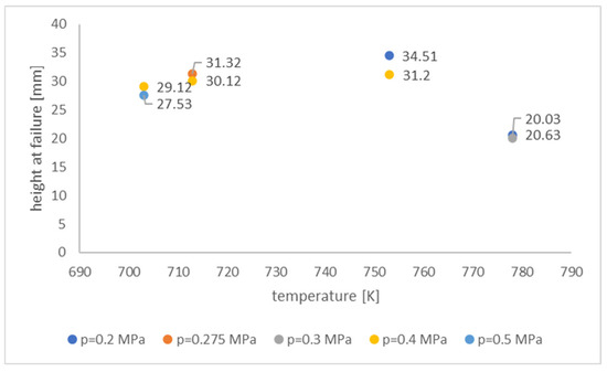 The equipment used to carry out the free-forming test is described in Section 2.2. Figure 3 shows the value of the height of the dome, once broken, for different adopted values of the test temperature and pressure. In particular, while the used test temperatures are 703, 713, 753, and 778 K, respectively, the pressure values vary between 0.2 and 0.5 MPa.