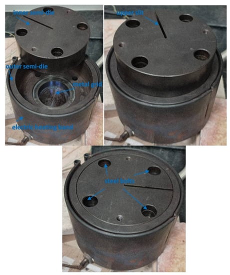 The design of the equipment used to perform the free-forming test was described in [48]. This equipment is placed on a workbench and is characterized by a die divided into two parts (Figure 4). Figure 4 presents the two half-dies and the way they are assembled.