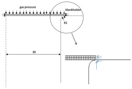 In the scheme, there is a die on which the metal sheet is located, which was modeled as a rigid body. To simulate the presence of a blank holder, the nodes on the outer edge of the sheet were suitably constrained. In particular, the movement of the node on the edge of the metal sheet in contact with the die was locked. The further nodes on the metal sheet edge were constrained not to move in the radial direction. Figure 6 shows, through a zoomed-in view, how the boundary conditions were applied on the outer edge of the sheet. Similarly, the nodes of the metal sheet on the axis of symmetry had a zero displacement along the direction perpendicular to the axis of symmetry. An evenly distributed pressure was applied to the upper edges of the sheet. The constitutive function of the magnesium superplastic alloy material and the forming pressure value were introduced by the use of a subroutine. The m and K parameters of Equation (1) were related to the equivalent strain as described in Equation (2).