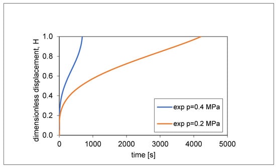In Section 2.1 it was established, as a first result, that the AZ31 magnesium alloy showed the best superplastic properties (i.e., it reached the maximum displacement at the dome apex in a free-forming process) at 753 K and for pressure values between 0.2 and 0.4 MPa (see Figure 3). These test conditions were used to carry out free-forming tests at constant pressure. Figure 7 shows the experimental dimensionless displacement–time H–t curves obtained by carrying out free-forming tests at two values of pressure, p1 = 0.2 MPa and p2 = 0.4 MPa, which were kept constant. Figure 7 shows that, to reach a unit dimensionless displacement (and, therefore, to obtain a hemisphere) (H = 1), doubling the applied pressure involved a reduction in the forming time by about 84%.