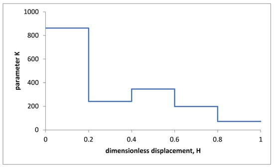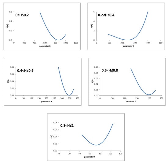 From Figure 9 it can be seen that the minimum of the F(K) function was zero when 0 ≤ H ≤ 0.6, while the function assumed a value of approximately 0.0025 for 0.6 < H ≤ 0.8 and approximately 0.016 for 0.8 < H ≤ 1. Figure 10 highlights the trend of the K–H curve.