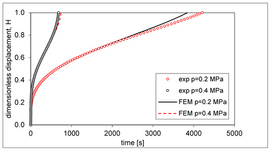 Comparison of H–t curves obtained numerically and experimentally for p = 0.2 and 0.4 MPa.