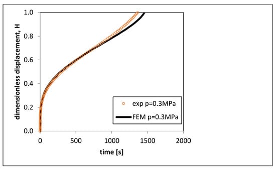 Comparison of H–t curves obtained numerically and experimentally for p = 0.3 MPa.