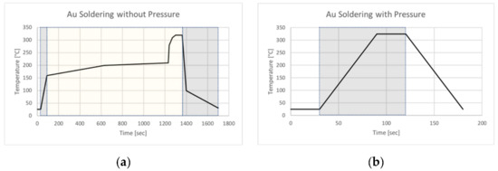 Temperature profile used for the soldering process with AuSn alloy as the interconnection material, without (a) and with (b) pressure. The grey regions indicate an N2 atmosphere, while the light-yellow region indicates the additional presence of formic acid gas in the oven.
