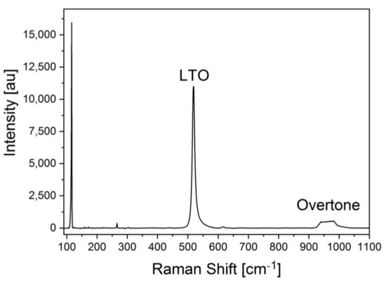 Silicon is a diamond-type material. The Raman spectrum of the unmounted Si sample, reported in Figure 5, consists of an intense Raman signal with full width at a half maximum of ca. 8 cm−1, centered at ~520 cm−1, and corresponding to the zone-center (q = 0) optical phonon O(Γ), and a broad peak at 950 cm−1, the second order Raman signal. These signals are comparable to those reported in the literature [26]. The first peak is associated with two transverse and one longitudinal branches, which are labelled as a single LTO branch. In the figure, plasma lines are also observable at 116 and 265.5 cm−1.