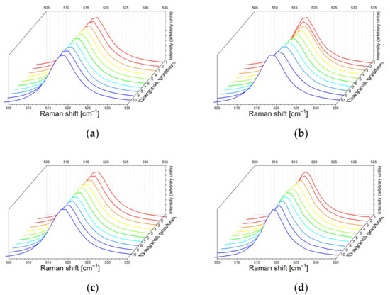 - Anastassakis, E.; Pinczuk, A.; Burstein, E.; Pollak, F.H.; Cardona, M. Effect of static uniaxial stress on the Raman spectrum of silicon. Solid State Commun. 1993, 88, 1053–1058. [Google Scholar] [CrossRef]
