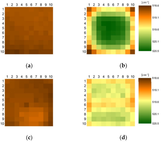 These observations can also be derived from Raman data collected from the complete mapping of the samples. The distributions of the peak positions over the area of the chips are reported on the color maps in Figure 7 and reveal an asymmetric distribution in the unmounted and mounted with pressure samples; in contrast, there is a symmetric distribution over the area of the chip mounted without pressure, with higher values in the center of the chip, with respect to the corners.