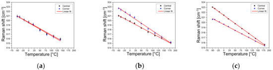 For the Si_Unmounted, A_AuSn_p, and A_AuSn samples, the Raman-shift values of the 520 cm−1 peak were collected from −50 to 180 °C, at increasing temperature, in the center of the chip (position [6, 6]) and in a corner (position [1, 1]), which are the positions that typically correspond, respectively, to a more and a less stressed area of the sample [6,7,13]. These Raman shifts are reported in Figure 8 and show a linear trend with different intercept and slope values, whose values are reported in Table 3. It is evident how temperature affects the Raman shift value of all samples: as temperature increases, the Raman shift values decrease. Moreover, in the central position, there is a marked difference between Si_Unmounted and mounted samples, reaching the higher values with the A_AuSn assembly, whereas in the corners there are no marked differences in intercepts and slopes. This means that the center, the most stressed area, is more affected by thermal processes than the corner.