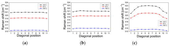 The Raman shift values, collected on the diagonal of the chips on copper substrates, at −50 °C, 20 °C, and 180 °C are reported in Figure 9: the Raman shift values decrease at increasing temperature.