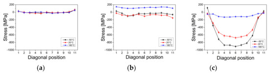 Stress distribution along the diagonal recorded at −50 (Black points and lines), 20 (Red points and lines) and 180 °C (Blue points and lines), on the Si_Unmounted chip (a), the A_AuSn_p sample (b) and the A_AuSn sample (c). Position i refers to the position [x, x] of Figure 4b.