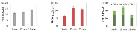 Additionally, the extract’s chlorophyll content mainly consisted of chlorophyll a. Chlorophyll b was present in smaller quantities, while chlorophyll c was even more limited (Figure 1c, Figure 2c, Figure 3c, Figure 4c and Figure 5c). This observation could be justified by the dominance of chlorophyll a over b and c in Chlorella biomass [40,41].