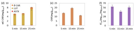 The effect of increasing time, from 5 to 15 and eventually 25 min, on the MAE at 50 °C, 55 mLsolv/gbiom and 550 watts is illustrated in Figure 1. The extraction yield was slightly increased during the elevation of extraction duration (Figure 1a). In addition, the total phenolic (Figure 1b), chlorophyll (Figure 1c), carotenoid content (Figure 1e), and extract’s antioxidant activity (Figure 1e) were favored during time increase from 5 to 15 min, while extraction for 25 min led to a value decrease of the aforementioned responses. However, the extraction for 25 min improved the selected carotenoid content, especially lutein (Figure 1d). In general, the increase in extraction time results in the improvement of extraction yield [42]. Still, the prolonged extraction duration and extended exposure to microwave irradiation may lead to the degradation of certain thermolabile bioactive compounds [43]. Similar observations were also made in other studies regarding the deterioration of chlorophyll [44], carotenoid [21,45] and phenolic content [42,46], as well as the extract’s antioxidant activity [42,46] of algal or different types of extracts after prolonged MAE.