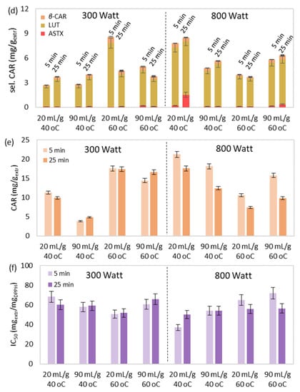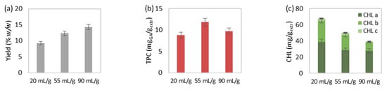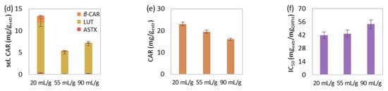 The increase of solvent-to-biomass ratio, from 20 to 55 and eventually 90 mLsolv/gbiom, during MAE at 50 °C, 15 min and 550 watts led to extraction yield improvement (Figure 2a). However, chlorophylls (Figure 2c), carotenoids (Figure 2e), as well as the extract’s antioxidant activity (Figure 2f) were not favored by the solvent-to-biomass ratio rise and therefore were decreased. The selected carotenoid content (Figure 2d) was negatively affected by the ratio increase, but lutein was slightly increased above 55 mLsolv/gbiom. Finally, total phenolic content (Figure 2b) initially improved from 20 to 55 mLsolv/gbiom, while further solvent-to-biomass increase led to reduced values.