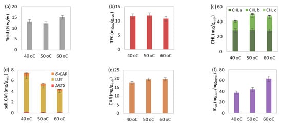 The effect of increasing temperature, from 40 to 50 and eventually 60 °C, on the MAE at 15 min, 55 mLsolv/gbiom and 550 watts is illustrated in Figure 3. The initial increase from 40 to 50 °C did not favor the extraction yield, while further temperature elevation led to improved recovery of total extract at 60 °C (Figure 3a). Moreover, the extract’s total pigment content was moderately improved during temperature increase (Figure 3c,e). The above observations could be justified by the decrease of solvent’s viscosity from 40 to 60 °C, and therefore an increase of its solvation power [57,58].
