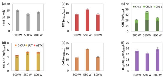 The effect of microwave power on MAE’s (a) extraction yield, extract’s total (b) phenolic and (c) chlorophyll content, (d) selected and (e) total carotenoid content, and (f) antioxidant activity. The extraction conditions of the single-factor experiments were maintained at 50 °C, 55 mLsolv/gbiom and 15 min.