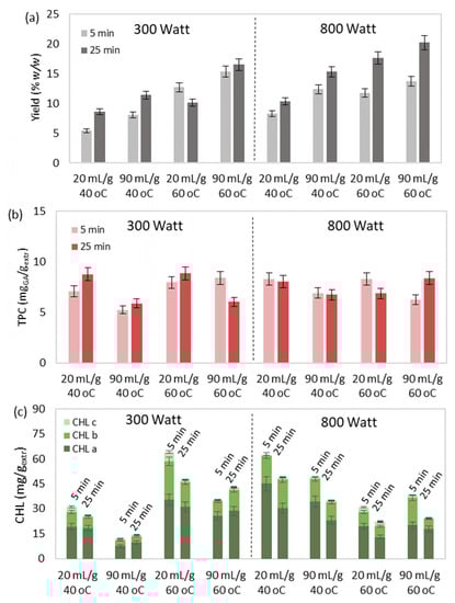 The extracts obtained from MAE demonstrated a dark green color and a slight fishy odor. The experimental results of all the examined responses are presented in Table 2. The extraction yield presented a wide value range depending on the applied extraction conditions and varied from 5.42 to 20.18% w/w, which correspond to the mildest and the most intense operational conditions, respectively.
