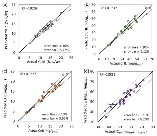 Experimental versus predicted values of (a) extraction yield, (b) total chlorophyll content, (c) total carotenoid content, and (d) antioxidant activity. The error bars refer to the experimental coefficient of deviation.