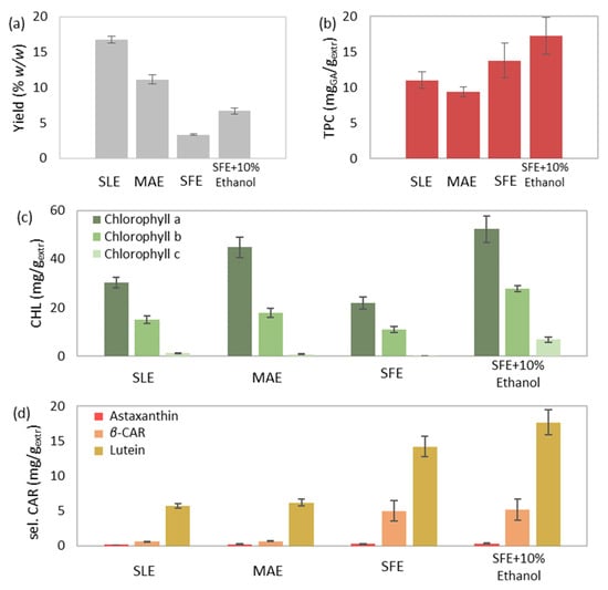 Comparison between the conventional solid-liquid extraction (SLE), microwave-assisted extraction (MAE), supercritical fluid extraction (SFE) and supercritical fluid extraction with 10% w/w cosolvent addition (SFE + 10% Ethanol) of Chlorella vulgaris, regarding the (a) extraction yield, total (b) phenolic and (c) chlorophyll content, (d) selected and (e) total carotenoid content, and (f) antioxidant activity.